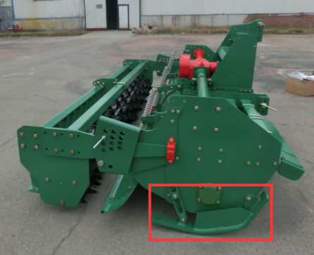 在机具的后侧设置后护板,护板上设置有压簧,如图4所示,后护板的设置起到平整的作用,有效保证旋耕后地面的平整度;护板起到挡住损坏的刀片不飞出伤到人,还对减少尘土飞扬有明显效果,从而减少尘土污染。